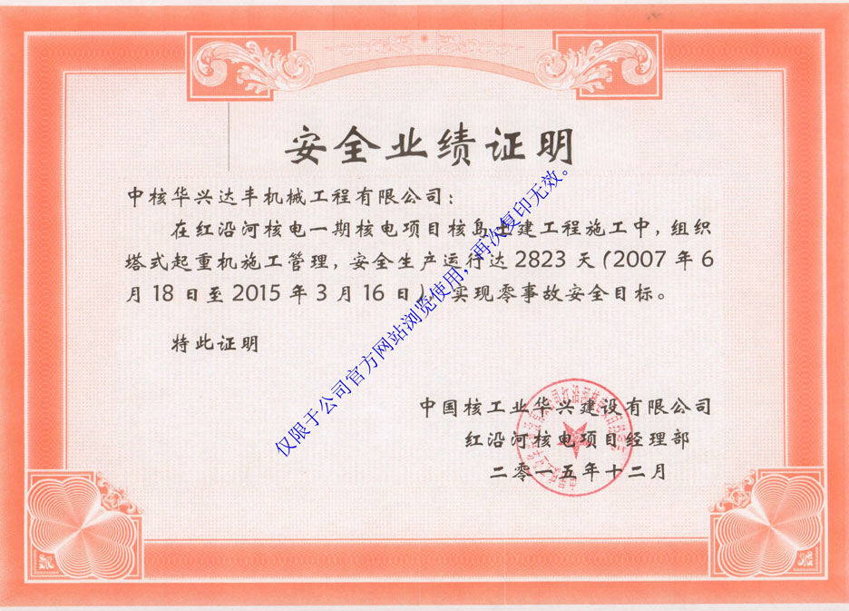 安全業(yè)績證明(紅沿河核電一期核電項目核電工程施工)