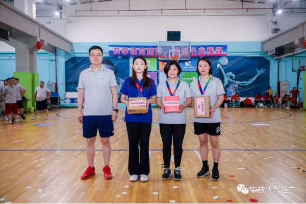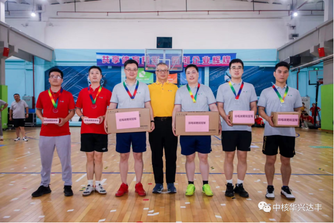 中核華興達豐董事兼總經(jīng)理朱輝為羽毛球男雙運動員頒獎