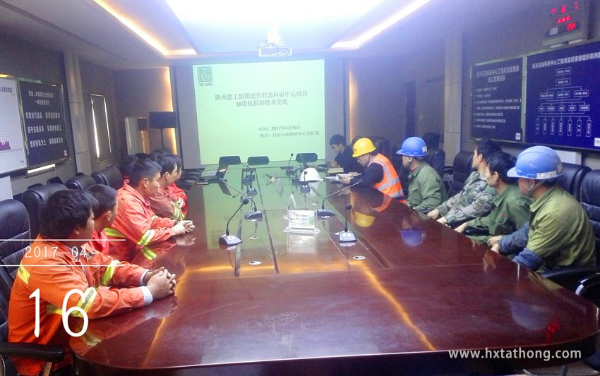 在接到陜建集團的拆除要求后,陜西分公司積極組織策劃并制定了拆卸小組和拆卸計劃,2017年4月16日全體拆卸相關(guān)人員到陜建延長石油項目會同甲方安全總監(jiān)范明軍以及安全主管和監(jiān)理工程師進行技術(shù)安全交底會,甲方要求在確保安全的前提下盡可能提早完成本次拆卸作業(yè)。