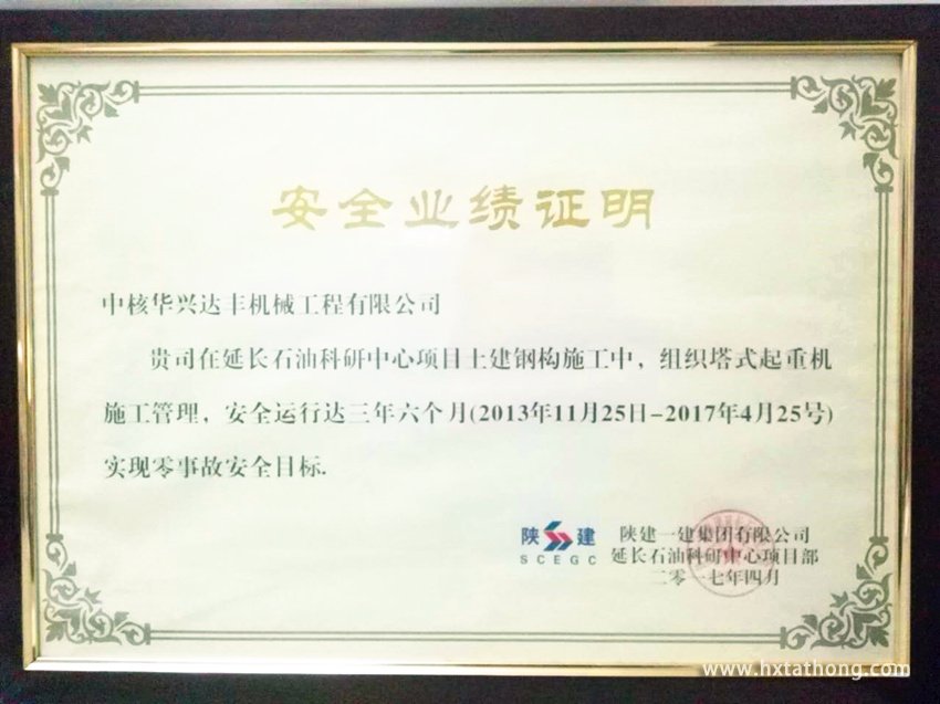 甲方項目經(jīng)理對中核華興達豐在該項目的整體運行服務予以高度評價,認為我司的表現(xiàn)超出了他們的預期,為項目的垂直運輸以及項目主體的順利完工做出了巨大的貢獻?!?span style="font-family: 微軟雅黑, 'Microsoft YaHei'; font-weight: bold;">服務精細、客戶至上,安全第一、值得信賴”是陜西一建集團公司對我司陜西延長石油科研中心項目服務的最高評價。甲方授予我司的安全業(yè)績證明上寫著 “中核華興達豐機械工程有限公司在延長石油科技中心項目土建鋼構(gòu)施工中,組織塔式起重機施工管理,安全運行達三年六個月(2013年11月25日-2017年4月25日)實現(xiàn)零事故安全目標”,這對于我司來說是一種無上的榮耀!這是一種榮譽,也是對該項目中每一個工作人員長達三年零六個月辛勤付出的肯定,同時是我司嚴抓安全管理的成果,是我司“厚德、安全、卓越”核心理念以及“以匠人之心、做品質(zhì)服務”經(jīng)營理念的體現(xiàn)!未來,我們將再接再厲,為每一位中核華興達豐的合作伙伴提供的優(yōu)質(zhì)服務。